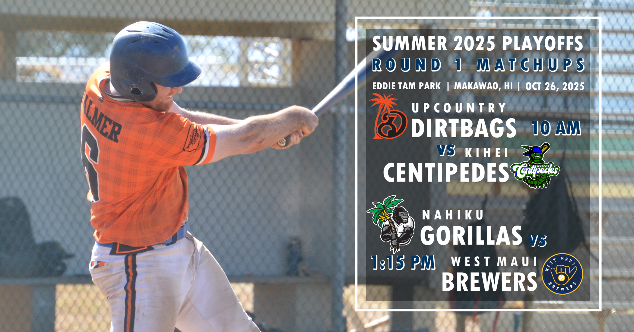 The Summer 2025 Maui Adult Baseball League playoffs get underway Sunday, October 26 at Eddie Tam Memorial Park in Makawao. The defending champion Kihei Centipedes (3rd seed, 9-3 record) will host the Upcountry Dirtbags (6th seed, 2-10 record) at 10am, with the Nahiku Gorillas (5th seed, 4-8 record) making their franchise playoff debut against the West Maui Brewers (4th seed, 8-4 record) at 1:15pm.